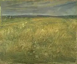 By 1896, Kuroda was at the peak of his career.[12] That May Okakura Tenshin, the Dean of the Tokyo School of Fine Arts (Tokyo Bijutsu Gakkō, present-day Tokyo National University of Fine Arts and Music), appointed Kuroda as the director of the newly established Department of Western-style Painting.[15] This allowed him to design an even broader curriculum, meant for general students of art, and to be better equipped to reach a broader public. An academic role, with its emphasis on structure and conformity, contrasted with the painter's focus on individuality, but Kuroda nonetheless approached his new role with zeal. In particular, Kuroda stressed the importance of painting outdoors directly from nature (plein air), and insisted that courses in anatomy and the sketching of a live nude model be included in the curriculum.[14]