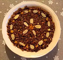 Kutia or kutya (Belarusian: куцця [kuˈt͡sʲːa]; Russian: кутья [kʊˈtʲja]; Ukrainian: кутя [kʊˈtʲɑ] ⓘ) is a ceremonial grain dish with sweet gravy traditionally served mostly by Eastern Orthodox Christians and some Catholic Christians predominantly in Belarus, Russia, Ukraine, but also in parts of Lithuania[1] and Poland during the Christmas–Feast of Jordan holiday season or as part of a funeral feast. The word with a descriptor is also used to describe the eves of Christmas, New Year, and Feast of Jordan days.[2][3][4]