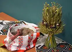 In Ukraine kutіa is one of the two essential ritual dishes at the Ukrainian Christmas Eve supper[6] (also known as Svyata vecherya). The ritual significance of kutia, as well as uzvar, is quite ancient. Ukrainian ethnographer Fedir Vovk traces the origins of these dishes to the Neolithic era. Before dinner, the kutia is placed in the icon corner ("kut") , the most honorable place in the house where religious icons or images are placed. The pot with the kutia was to stand there in a designated spot from Rizdvo (Christmas on December 25) to January 1, New Year's Day (formerly January 6 to the Old New Year in January 14).[7] There is also a custom of sending children with kutia to relatives, usually grandparents and godparents. After dinner, the kutia is left on the table for the whole night with spoons for the dead ancestors, "so that our relatives would have dinner and not be angry with us." The religious nature of the dish is emphasized by an ancient custom, when the head of the family approached the window or went out into the yard with a spoonful of kutia and, addressing the frost, invited him three times to take part in dinner with the family. When the frost does not appear, he is advised not to appear, not to do harm to crops, etc.: "Frost, frost, come to us to eat kutia, and if you don't come, don't come for the rye, wheat and other crops."[8][9][10]