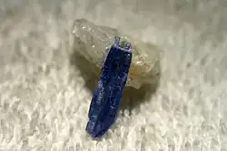 Kyanite's elongated, columnar crystals are usually a good first indication of the mineral, as well as its color (when the specimen is blue). Associated minerals are useful as well, especially the presence of the polymorphs of staurolite, which occurs frequently with kyanite. However, the most useful characteristic in identifying kyanite is its anisotropism. If one suspects a specimen to be kyanite, verifying that it has two distinctly different hardness values on perpendicular axes is a key to identification; it has a hardness of 5.5 parallel to {001} and 7 parallel to {100}.[2][3] Thus, a steel needle will easily scratch a kyanite crystal parallel to its long axis, but the crystal is impervious to being scratched by a steel needle perpendicular to the long axis.[6]