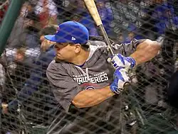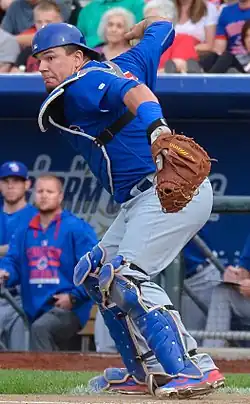 The Cubs promoted Schwarber to the major leagues on June 16, 2015, to serve as a designated hitter for six games during interleague play.[19] Schwarber made his major league debut as a position player that night, replacing ejected starting catcher Miguel Montero in the eighth inning against the Cleveland Indians at Wrigley Field.[20] The following night, as a designated hitter, he got four hits in five at bats with two RBI and six total bases after the Cubs and Indians both traveled to Cleveland. The Cubs sent Schwarber to the Triple-A Iowa Cubs of the Pacific Coast League after the six games.[21] On July 16, 2015, Schwarber was recalled from Triple A Iowa, to rejoin the Cubs due to an injury to catcher Montero.[22] On July 21, in a 5–4 extra-inning victory over the Cincinnati Reds, Schwarber hit a game-tying two-run homer in the ninth inning and a solo go-ahead home run in the top of the 13th to give the Cubs the lead.[23] Over the course of the season he split time between catcher and outfield positions. He finished the 2015 regular season having played 69 games, recording a .246 batting average with 16 home runs, 52 runs scored, and 43 RBI in just 273 plate appearances.[24] In the National League Wild Card Game, Schwarber drove in three runs and hit a long two-run home run to help the Cubs defeat the Pittsburgh Pirates, 4–0, and advance to the Division Series against the St. Louis Cardinals.[25] In the NLDS, Schwarber helped the Cubs to a 3–1 series victory with two home runs, including a mammoth Game 4 homer that landed on top of the new Wrigley Field scoreboard in right field.[26] The ball was removed during the 2015–16 off-season to prevent theft but was encased in Plexiglas and returned "to where it landed".[27] In his eighth career postseason game, a 5–2 loss to the New York Mets in Game 3 of the 2015 National League Championship Series (NLCS), Schwarber set a Cubs record with his fifth career postseason home run and also the record for the most home runs in a single postseason by a player age 22 or younger, passing Miguel Cabrera.[28]