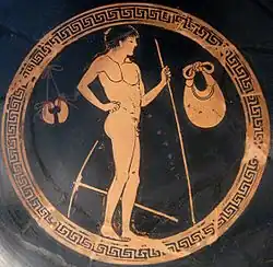 It is known that athletes in Ancient Greece were highly praised but pentathletes specifically were highly regarded. In Aristotle's Rhetoric he writes two times why pentathletes are the most handsome and best athletes culminating it with "he who excels in all [is] for the pentathlon".[6] These athletes had to be very versatile and flexible in their abilities in order to win the event overall and that is what made them so special. Since the five events required different muscles and strength to succeed, someone that could master all of them to a point of victory was impressive and therefore deserved respect. In addition, the victors of athletic events gained elite status and were sometimes invited to engage in special activity like sitting in the front row or prohedria of a theatrical production.[7] These added benefits along with the frequent depiction of athletes in Greek art shows the high regard the society held for athletes.