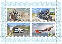 On November 18, 2014, Kyrgyz Express Post issued its first postage stamps and souvenir sheet. The issue was dedicated to the 140th anniversary of the UPU. Stamps depict the history of the Kyrgyz postal service, namely the means of postal transportation.[3]