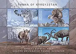 On November 19, 2014, KEP issued the second series of stamps, dedicated to the Fauna of Kyrgyzstan. These stamps depict typical representatives of the Kyrgyz animal world: Saker Falcon, Yak, Central Asian Ibex and Snow Leopard.