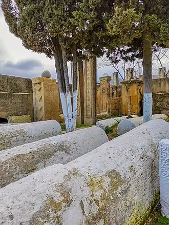 According to medieval Arabic sources and the local historical chronicle "Derbent-name",[5] this burial is associated with the first campaign of the Muslims in the Caucasus led by the sahaba (companion) Salman ibn Rabiah al-Bahili. During the further advance into the Western Turkic Khaganate, part of the Arab army was killed in the battle, and among them 40 companions of the Prophet Muhammad.[6] These 40 companions are buried in the Kyrkhlyar cemetery,[5] from which the name of the cemetery comes. In subsequent centuries, the cemetery was constantly expanded.[4] As a burial place for martyrs (shahid), it became a place of pilgrimage (ziyarat) for Muslims.[4]