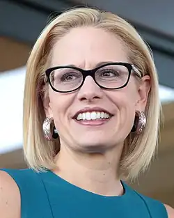 Sinema won the 2018 Senate election to replace the retiring Jeff Flake, defeating Republican nominee Martha McSally. She became the first openly bisexual and the second openly LGBTQ woman (after Tammy Baldwin) to be elected to the Senate.[4] Sinema also became the first woman elected to the Senate from Arizona[5] and the only religiously unaffiliated member of the Senate.[6] She was one of four independents in the Senate, alongside Bernie Sanders, Angus King, and Joe Manchin, all of whom caucused with the Democrats.