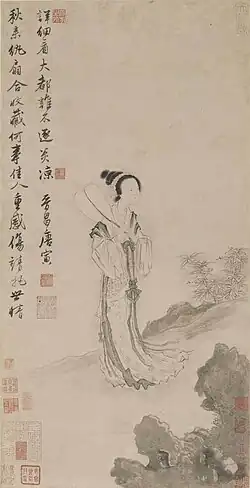 The knot at the waist by ribbon can be seen from many artworks especially in the beauty painting, and ancient literature description recorded that the tradition of knot ribbon can be traced back to the Spring and Autumn period (770 – 76 BCE); for example, in the chapter Zhaogong (昭公) of the Zuo Zhuan (左傳), the tradition of tying ribbon as knots to the belt is recorded.[6]