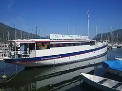 In 1976, Alain Prud'homme bought the ferry Hautecombe and used it as headquarters for his sailing school. The ship took back its original name and was moored at the Grand Port of Aix-les-Bains, near the docks for the company's ships . It was later converted into a maritime store. On February 8, 2015, it dragged its anchor and a part of its gangway was snatched due to strong winds.[2] The ship was not damaged and the gangway was repaired some days later.