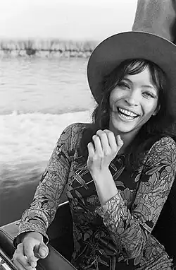 In mid-1968 Gainsbourg started a relationship with English singer and actress Jane Birkin, 18 years his junior, whom he met when she was cast as his co-star in Slogan (1969).[4] In the film, Gainsbourg starred as a commercial director who has an affair behind the back of his pregnant wife with a younger woman, played by Birkin.[50] Gainsbourg also provided the soundtrack and dueted with Birkin on the title theme "La Chanson de Slogan". The relationship would last for over a decade.[51] In July 1971 they had a daughter, Charlotte, who would become an actress and singer.[52] Although many sources state that they were married,[53] according to Charlotte this was not the case.[51] After filming Slogan, Gainsbourg asked Birkin to re-record "Je t'aime..." with him.[2] Her vocals were an octave higher than Bardot's, contained suggestive heavy breathing and culminated in simulated orgasm sounds. Released in February 1969, the song topped the UK Singles Chart after being temporarily banned due to its overtly sexual content. It was banned from the radio in several other countries, including Spain, Sweden, Italy and France before 11pm.[54] The song was even publicly denounced by The Vatican.[55] It was included on the joint album Jane Birkin/Serge Gainsbourg, which also contained "Élisa" and new recordings of songs written for other artists including "Les sucettes", "L'anamour" and "Sous le soleil exactement". In 2017, Pitchfork named it the 44th best album of the 1960s.[46] He and Birkin would share the screen in another Gainsbourg-scored film, Cannabis (1970), in which he played an American gangster who falls in love with a girl from a wealthy family.[56]