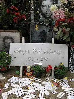 Gainsbourg, who smoked five packs of unfiltered Gitanes cigarettes a day,[95] died from a heart attack at his home on 2 March 1991, aged 62.[54] He was buried in the Jewish section of the Montparnasse Cemetery in Paris.[34] French President François Mitterrand paid tribute by saying, "He was our Baudelaire, our Apollinaire ... He elevated the song to the level of art."[2] In her first interview after her father's death, his daughter Charlotte told Vanity Fair: "He was a poet. What he did was way ahead of its time. You can just read his lyrics—he plays with words in such a way that there are double meanings that don't work out in English. He was just so very authentic. He was so shy, and very touching. And he was very generous. Every time I get into a taxi [in Paris] I hear a story about my father, because he used to take taxis all day long and [the drivers] tell me how sweet he was. One day a taxi driver told me my father had paid for his teeth to be mended; somebody else's roof needed to be mended and he paid for that. He just had real relationships with people from the street. He was selfish in ways that artists can be, but there was no snobisme. He was always amazed at the fact that he had money. I remember going to lovely hotels with him and he was like . . . ‘Oooh, how fun this is.' He had the eyes of a child."[96]