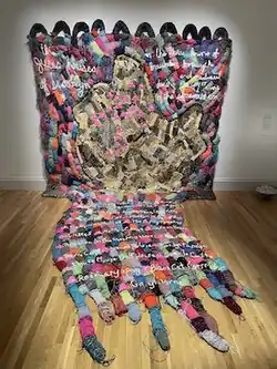 Roberts's work consists primarily of large-scale installations knitted with children's toy knitting cranks including sock making machines and Barbie knitting tools.[8][3][9] Throughout their career, Roberts has been most influenced by activist art about HIV/AIDS, and uses their craft as a form of activism as well.[6] Their current artist's statement regarding craft, is to "reclaim the mastery of craft to create an alternative set of tools that could potentially dismantle 'the master's house." This is part of their passion in using craft, especially knitting, to push the boundaries in institutions.[10] Moreover, Roberts finds that the issues of marginality they encounter as a queer, gender non-conforming and non-binary person, directly mirror the position(s) of textile and craft within visual culture.[11] All of these materials are also portable, accessible, and can adapt to a variety of circumstances.[12]