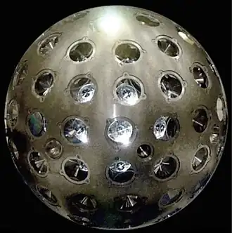The satellite is made of THA-18N, a tungsten alloy,[6] and houses 92 cube-corner retroreflectors, which are used to track the satellite via laser from stations on Earth. LARES's body has a diameter of about 36.4 centimetres (14.3 in) and a mass of about 387 kilograms (853 lb).[1][7] LARES was inserted in a nearly circular orbit near 1,451 kilometres (902 mi) and an inclination of 69.49 degrees. The satellite is tracked by the International Laser Ranging Service stations.[8]