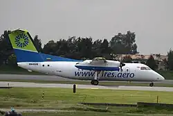 - On 28 January 2008, AIRES Flight 053, Bombardier Dash 8-200 (registered HK-3997), overran the runway at El Dorado International Airport, en route from Maracaibo, Venezuela after the left gear collapsed. The probable cause of the crash was that the aircraft was carrying out a landing with an unresolved fault in the left engine, which prevented the aircraft from being able to stop within the length of runway available, causing a runway excursion. A contributing factor was the failure to correct the maintenance reports in a satisfactory manner and the failure to properly follow up on repetitive entries. None of the 41 occupants were injured. The aircraft was substantially damaged and written off.[18]