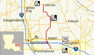 From the south, LA 445 begins near Lee's Landing. It heads north, intersects LA 22 and turns eastward to follow it for about a half-mile before turning back north. The highway heads toward the community of Robert, crossing Sims Creek and then intersecting (overpassing) I-12 at a folded-diamond interchange (Exit 47). At Robert, LA 445 and US 190 cross at a traffic signal. Continuing northward, LA 445 meets LA 40 (which it overlaps for about one mile) near Uneedus and passes along the eastern boundary of the Zemurray Gardens Lodge Complex.[2] After a northwestward jog, LA 445 meets LA 1062 near Husser. At that point, the road turns back northward (becoming Husser Road) until it ends at LA 16 east of Amite.