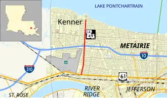 At this time, the route still followed the entirety of Williams Boulevard from the Mississippi River at 3rd Street, which was now LA 48, to Lake Pontchartrain.[3][14] Since the late 1980s redevelopment of Kenner's riverfront as the Rivertown Historic District, the southern portion of the route between LA 48 and US 61 has been returned to local control. The northern end of LA 49 has also been slightly shortened from its original terminus at the Lake Pontchartrain levee.[3][15]