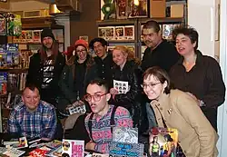 2014 signing for the LGBT anthology Qu33r at Jim Hanley's Universe in Manhattan. From left to right, back row, are Sabin Calvert, Katie Fricas, Carlo Quispe, Abby Denson, Ivan Velez, Jr. and Jennifer Camper. From left to right, front row, are L. Nichols, Sasha Hedges Steinberg and Laurel Lynn Leake.