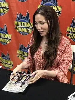 Writer Marjorie Liu autographing a copy of Astonishing X-Men #51 (August 2012), in which she depicted the marriage of superhero Northstar and Kyle Jinadu, the first same-sex wedding in mainstream comics