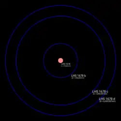 The red dwarf LHS 1678 hosts three exoplanets, which are smaller than Earth and were discovered by the transit method.[7] The first exoplanets discovered were LHS 1678 b and c, discovered by Silverstein et al. 2022, which also announced the existence of a third possible exoplanet.[3] This planet was later confirmed in 2024, and received the designation LHS 1678 d.[5]