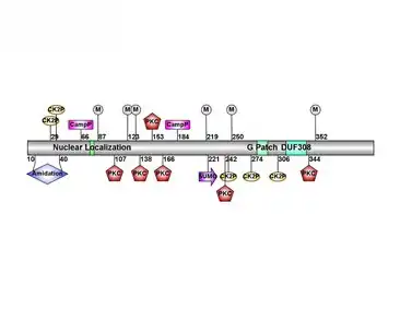 The LOC100287387 protein is formed by a 423 amino acid peptide sequence. The molecular mass is 44.4 kdal,[5] and the isoelectric point is 10.77.[6] There is a G-patch domain and a short domain of unknown function within the peptide sequence. There are many predicted modification sites within the amino acid sequence including cAMP- dependent phosphorylation sites (CampP), casein kinase 2 (CK2), and protein kinase C (PKC) phosphorylation sites, O-linked beta-N-acetylglucosamine sites, and a sumoylation site.[3][7] The predicted secondary structure of the protein includes 8 short alpha-helices (15.6% of the protein), 14 short extended strands (12.1%), and the rest as random coils (72%).[8]