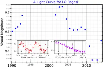 ![]() A visual band light curve for LO Pegasi. The main plot (adapted from Karmakar et al.[1]) shows the long-term variability. Inset plot "A" (adapted from Kiraga[2]) shows the periodic variability, and inset "B" (also adapted from Karmakar et al.[1]) shows a flare. | |