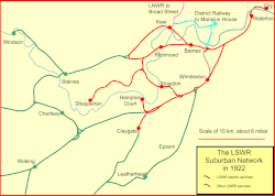 This article deals with the development of the London suburban railway lines of the London and South Western Railway (LSWR). For the wider view of the LSWR in general, see London and South Western Railway.