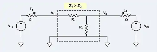 If a source and load are both resistive (i.e. Z1 and Z2 have zero or very small imaginary part) then a resistive L pad can be used to match them to each other. As shown, either side of the L pad can be the source or load, but the Z1 side must be the side with the higher impedance. [2]