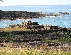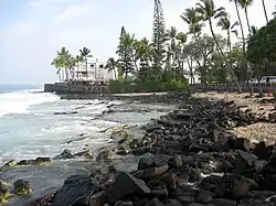 In the Hawaiian language, la'a loa means "very sacred".[2] Several Archaeological sites are in the area.[3] The ruins of haukalua Heiau (an Ancient Hawaiian temple) are on a point just south of the beach, at the parking lot which was added in 2000.[4] The stone structure was cleared and restored and a small ceremonial platform (lele) constructed by descendants of the people who lived in this area for hundreds of years.[5] A small rocky cove south of the point is popular for scuba diving in calm conditions.