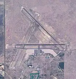 In 1942 the airport was taken over by the United States Army Air Forces and assigned to the Western Flying Training Command (WFTC) and the airfield was expanded to accommodate a large number of aircraft and training flights. Three asphalt runways were constructed in a triangle layout, 8000x150 (NE/SW), 8000x150 (E/W), 8000x150 (NW/SE) along with a large aircraft parking apron, taxiways, landing aids and several large aircraft hangars. In addition, four auxiliary airfields were constructed to accommodate training flights and emergency landings: