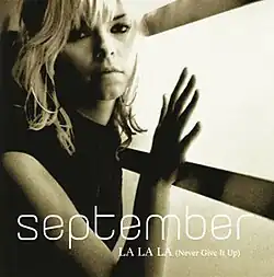 "La La La (Never Give It Up)" is the debut single by Swedish singer and songwriter September. It was released on 2 June 2003 on Stockholm Records and is featured on September's self-titled debut album, released in 2004. "La La La (Never Give It Up)" peaked at No. 8 on the Swedish single chart.[1] As of December 2007, it is ranked as No. 653 on Best place of all time on the Swedish charts.[1]