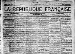 La République française (The French Republic) was a French daily newspaper, founded on 7 November 1871[1] by Léon Gambetta, with Eugène Spuller as chief editor. It continued publishing until 12 July 1924.[1]