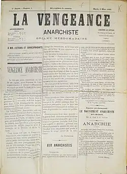 ![]() Front page of the first issue of La Vengeance anarchiste (6 March 1883) | |