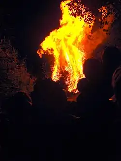 According to tradition, today's fires are reminiscent of those used in 1296 [7] to light the way for the Holy House on its way to Loreto,[8] which is still the ideal centre of this festival, and also the only one in which the institutions themselves are the interpreters of the tradition, ignored and sometimes obstructed by other administrations. Sometimes the Litanies of Loreto are still recited around the fire, invoking the protection of the Virgin Mary, "Gate of Heaven" and "Morning Star", as tradition dictates;[7] in other cases the focaraccio, or fogaró, has taken on a more profane character.