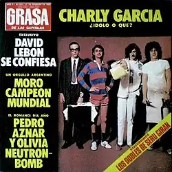 The word "grasa" means "grease" in Spanish, but in Argentina it is also slang for "tacky".[2] As such, the title of the album was a criticism of the superficiality of Argentine society at the time (which was living under a military dictatorship following the 1976 coup) among other aspects what it was considered then "commercial" music (as opposed to the more elaborate lyrics and musicianship supposedly present in genres such as prog rock) with disco music being parodied in the self-titled first track.[3][4][5][6] The cover of the album is a spoof of popular gossip magazine Gente, with members of the band presented as improbable celebrities (Aznar an obscure office worker, Moro a butcher, Lebon a rugby player and Garcia a petrol station worker – a criticism to petrol companies who "stuff themselves with money and run the world" according to Garcia[7][8]) one of the headlines announcing a romance between Aznar and "Olivia Neutron-Bomb" (cf Olivia-Newton John, the star of that year's blockbuster musical "Grease").