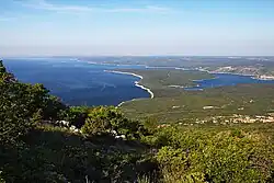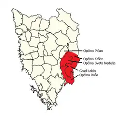 Labinština (Croatian: Labinšćina / Labinština,[1] Italian: L'Albonese / Agro Albonese) is the geographical and historical name of the eastern part of Istria county in Croatia. It covers an area of approximately 220 km2 that is 25 km long and 13 km wide. Geographical borders in the west are the Raša river, and the bay of the same name, in the south and east the sea, and in the north Plomin Bay, the southern part of the Učka massif and Kvarner Bay, and, until the beginning of the 20th century, Lake Čepić (Čepić basin). The center is Labin after which it is named. Labin was the head township of the Labinština or Agro Albonese under the Roman Empire, during the Venice Republic between 1365 and 1797, the Austrian rule between 1814-1918 and many other occupations by foreign armies.[2]