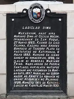 Ladislao Diwa y Nocon (June 27, 1863 − March 12, 1930) was a Filipino patriot who was among the founders of the Katipunan that initiated the Philippine Revolution against Spain in 1896.