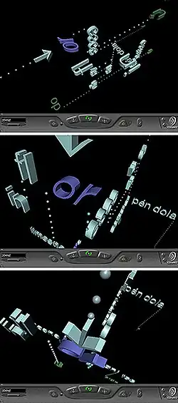 In the same sense and according to Dr. Hugues Marchal[23] from University of Basel, Switzerland, Győri produces a digital poetry in which the terms are generated by recombining their roots and constructing complex three-dimensional structures, vast lexical molecules which are gradually discovered and around which the spectator seems to revolve. His main objective is the development of virtual reality programs in which the viewer would have the feeling of truly touching letters and could directly modify their assembly.