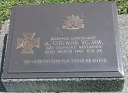 Lieutenant Albert Chowne (1920–1945 †) is buried there too. Chowne had served enlisted in the 2nd/13th Australian Infantry Battalion in Tobruk, Libya in 1941. Upon receiving his commission, he was with the 2nd/2nd Australian Infantry Battalion in New. Guinea when he was killed attacking an enemy foxhole. He received the Victoria Cross for his actions.
