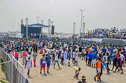 The origins of the event trace back to 1983 when the first marathon took place. The Lagos International Marathon is organized by the Athletic Federation of Nigeria and was preceded by several recurring half marathons held in the city where athletes like John Cheruiyot Korir,[5] Paul Malakwen Kosgei[6][7] and Dieudonné Disi emerged as winners.[8][9][10][11][12] The Marathon course, which spans a distance of about 42 km, starts at National Stadium, Surulere, Lagos, (where previous half marathons initially finished), continues along the Third Mainland Bridge, to the Lekki-Ikoyi link bridge and finishes at Eko Atlantic.