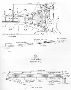 The construction of Chatuge Dam and its reservoir required the purchase of 11,641 acres (4,711 ha) of land, 1,904 acres (771 ha) of which had to be cleared. 278 families, 532 graves, and 40 miles (64 km) of roads (including part of U.S. Route 64 and all of NC 69) had to be relocated.[12] One house relocated from the Elf community during the clearing of the land later became the Clay County School District superintendent’s office until 2005.[4] TVA kept the dam's design simple and relied on basic building materials (i.e., earth and rock) in order to complete the dam as quickly as possible in hopes of allowing the reservoir to collect the 1941-1942 winter rains. The dam was constructed of impervious earthen fill fortified on both sides by riprap. The spillway was the only major part of the dam that required concrete. Since the reservoir would fill slowly and create mosquito-breeding environments, various measures were taken to prevent malaria outbreaks.[1]