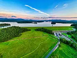 Chatuge Dam is a flood control and hydroelectric dam on the Hiwassee River in Clay County, in the U.S. state of North Carolina. The dam is the uppermost of three dams on the river owned and operated by the Tennessee Valley Authority, which built the dam in the early 1940s for flood storage and to provide flow regulation at Hiwassee Dam further downstream.[1] The dam impounds the 7,000-acre (2,800 ha) Chatuge Lake, which straddles the North Carolina-Georgia state line.[2] While originally built solely for flood storage, a generator installed at Chatuge in the 1950s gives the dam a small hydroelectric output.[3] At the time it was built, Chatuge Dam was the highest earthen dam in the world until the Aswan Dam was built in Egypt in 1964.[4] The dam and associated infrastructure was listed on the National Register of Historic Places in 2017.[5]