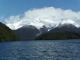 Lake Menéndez (Lago Menéndez) is a large lake in Chubut Province, Argentina. Lake Menéndez is in the chain of lakes in the Futaleufú River system of Argentina which via Yelcho Lake and the Yelcho River flows into the Pacific Ocean in Chile. Located in the Andes, Lake Menendez is Y-shaped, of glacial origin, and occupies two narrow valleys between glaciated peaks. The lake is in the Los Alerces National Park. There are no roads or other developments near the lake. Travel is by boat or foot. Lake Menéndez is noted for the extensive Alerce (Fitzroya) forests near the tips of its two arms.
