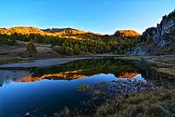 Slightly uphill from the lake is a mountain refuge named Capanna Mautino,[2] owned by the Sci Club Torino. This refuge serves as a base for summer or winter ascents to nearby peaks such as Mount Corbioun, Fournier Peak, or Saurel Peak.