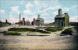 Among its provisions was the transfer of the lands around the lake from the Onondaga Nation to local salt producers on the condition that the salt would be produced for the common use of everyone.[20] By 1822, due to a high incidence of malaria, the lake's water level was lowered after its outlet to the Seneca River was dredged. The low-lying swampy area, located in what is now the northern end of downtown Syracuse, was drained.[19] The completion of the Erie Canal through New York State in the mid-1820s and the commercial production of salt brought an increase in settlement of the area. The lake's western shore became increasingly industrialized as the nineteenth century progressed.[6][22]
