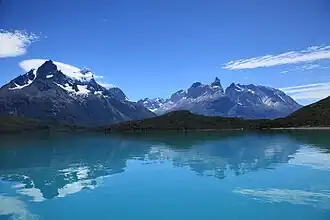 Lake Pehoé (Spanish pronunciation: [peoˈe]) is a surface water body located in Torres del Paine National Park, in the Magallanes Region of southern Chile. The lake is fed mainly by Paine River through the Nordenskjöld Lake, but it also receives the water from the outlet of Skottsberg Lake.[2]