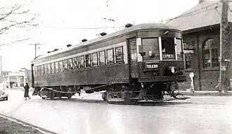 Starting around 1930, the LSE established a productive and growing freight business with neighboring interurban Cincinnati and Lake Erie RR. Together, the two traction lines with their connection at Toledo provided overnight delivery from the approximately 300 miles between Cincinnati and Cleveland. Steam railroads were unable to provide such fast service by a matter of days. At Toledo in 1936, 17,000 pounds of freight passed between the two lines.[3] Although barely profitable, the resulting freight business generated income allowing the two lines to survive and keeping its employees working. However, the deepening Great Depression further reduced this freight business, and the LSE declared bankruptcy in 1933. Operations continued under the direction of a court-appointed bankruptcy receiver. In 1937, LSE freight-service employees went on strike, and the LSE receiver terminated freight operations that day.[4] The next year, the railroad abandoned its remaining operations, which were passenger only. This also affected the Toledo connecting C&LE with the loss of freight business to Cleveland, and the C&LE was abandoned in 1939.[5]