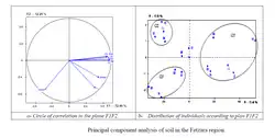 The observation of the correlation circle formed by the two axes F1 and F2, we show that the factor F1 expresses 72.40% of the variance (Figure 5). On this axis, the soluble salts (Ca++, Mg++, Na+, Cl-, SO4—and EC) are opposed to HCO3-which represents the carbonate alkalinity. This is an axis which probably reflects at the same time the phenomenon of salinization affecting certain types of soils and an alkalinization that develop on other [10].