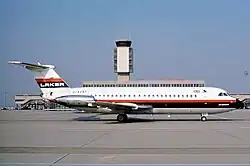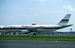 Laker spent more than £200,000 of his own money on the newly-ordered aircraft's deposits, with a consortium of City banks led by Clydesdale Bank funding the remainder.[4][10] He placed a follow-up order for a fourth aircraft to be delivered in 1968 and acquired a former-British Eagle aircraft from Bahamas Airways in 1971.[11][12][13] These airline's short- and medium-haul charter operations to holiday resorts in the Mediterranean and the Canary Islands were primarily operated with these aircraft.
