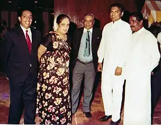 Athulathmudali's was first married to the Parsi Perin E. Captain.[9] She was the president of the Sri Lanka Cancer Society. He met his second wife Srimani De Seram in March 1978, when she was attached to UNCTAD in Switzerland. She was a friend of his brother Dayantha Athulathmudali. They got married in December 1981 in Geneva. They had one daughter, Serela Athulathmudali.[10]