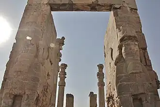 The colossal entrance figures were often followed by a hero grasping a wriggling lion, also colossal in scale and in high relief. In the palace of Sargon II at Dur-Sharrukin, a group of at least seven lamassu and two such heroes with lions surrounded the entrance to the "throne room", "a concentration of figures which produced an overwhelming impression of power."[14] They also appear on cylinder seals. Notable examples include those at the Gate of All Nations at Persepolis in Iran, the British Museum in London, the Louvre in Paris, the National Museum of Iraq in Baghdad, the Metropolitan Museum of Art in New York, and the University of Chicago Oriental Institute. Several examples left in situ in northern Iraq were destroyed in the 2010s by the Islamic State of Iraq and the Levant when they occupied the area, as were those in the Mosul Museum.