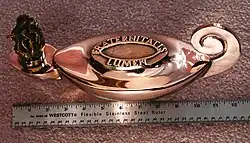 The "Lamp of Brotherhood" presently in Vancouver, British Columbia, Canada, is 31 cm long, 10.5 cm wide, and 14.5 cm high. Text on the upper surface reads: "Fraternitatis Lumen".